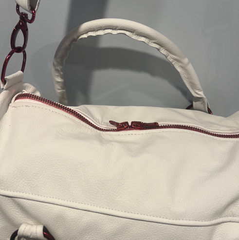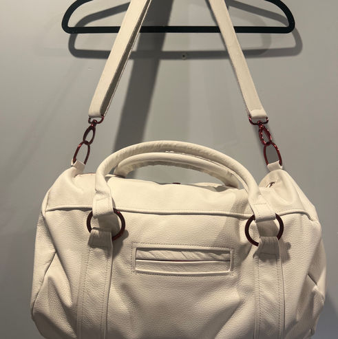 AP signature drum duffle bag in white with red hardware. The AP Drum Duffle is designed to be the perfect airport carry-on with ample space for clothes and electronics placed between them.